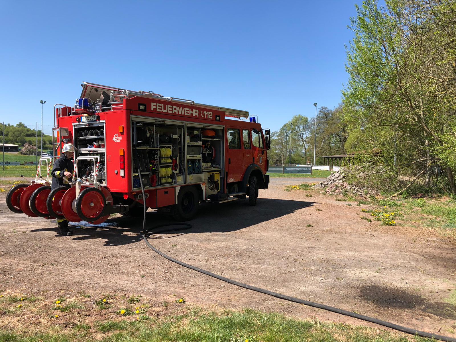 Lage: Noch während die Nachlöscharbeiten beim Flächenbrand im Ortskern liefen, wurde ein zweites Feuer am Sportplatz Vollmerz gemeldet. Die Feuerwehr Schlüchtern übernahm die Löscharbeiten mit ihren freien Fahrzeugen. Vor Ort trafen die Einsatzkräfte einen Haufen Grünschnitt an, der unbeaufsichtigt vor sich her brannte. Auf Grund der derzeitigen Trockenheit und akuten Waldbrandgefahr ist dies grob fahrlässig. Der Haufen wurde auseinandergezogen und abgelöscht.