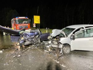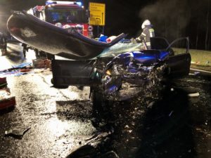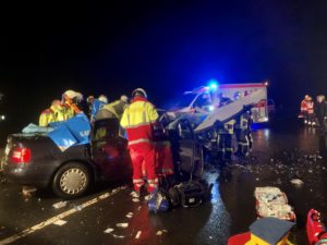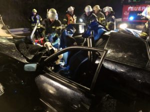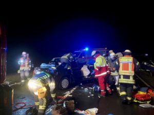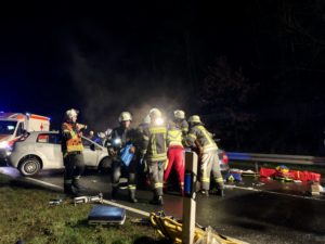 Lage: Die Innenstadtwehr wurde gemeinsam mit dem Rettungsdienst und der DRK Bereitschaft sowie der Polizei zu einem Verkehrsunfall mit eingeklemmter Person alarmiert. Da auf der Anfahrt durch die Leitstelle mitgeteilt wurde, dass es sich um 2 eingeklemmte Personen handeln soll, wurde sofort die Wehr Wallroth mit einem weiteren Rüstsatz nachalarmiert. Bei Eintreffen der Rettungskräfte war eine Person schon durch Ersthelfer befreit und eine weitere Person noch im PKW eingeklemmt. Durch die Feuerwehr wurde die Person mittels hydraulischem Rettungsgerät aus dem PKW befreit und an den Rettungsdienst übergeben. Bedauerlicherweise erlag die Person noch an der Einsatzstelle ihren schweren Verletzungen. Die zweite Person wurde vom Rettungsdienst in ein nahegelegenes Klinikum verbracht. Während der Unfallaufnahme durch den Sachverständigen wurde die Einsatzstelle von der Feuerwehr ausgeleuchtet. Für die Dauer der Rettungs- und Bergungsarbeiten war die Strecke voll gesperrt.